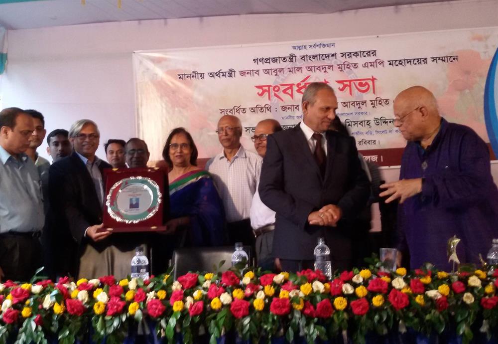 Hon'ble Finance Minister Mr. Abul Mal Abdul Mohit M.P. is delivering the chief guest speech at the Felicitation ceremony.